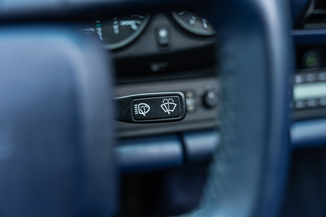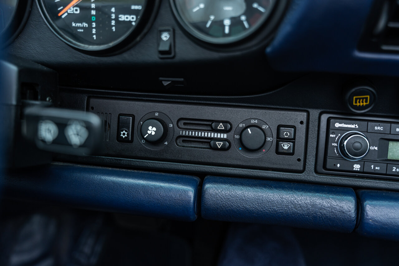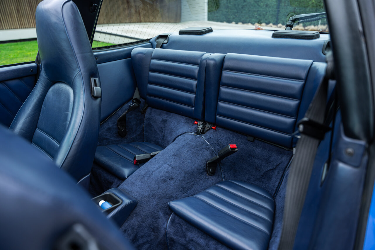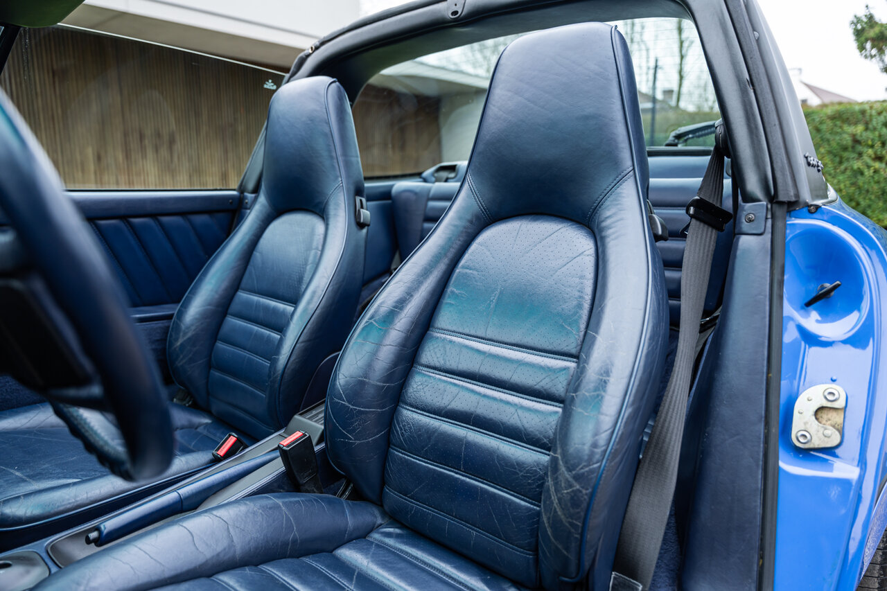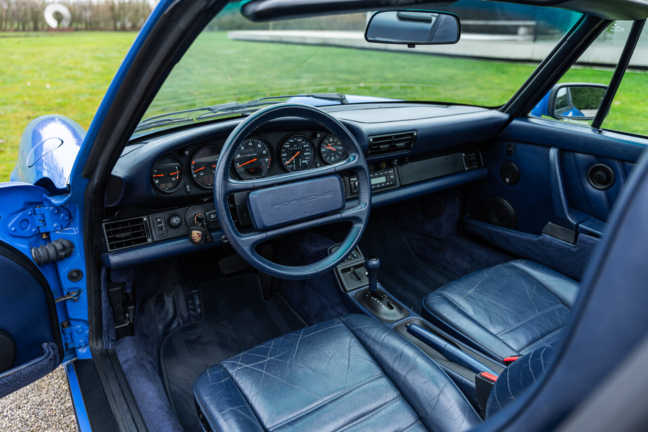 Het interieur is uitgevoerd in volledig lederen Cobalt Blue, wat een sublieme en perfect bijpassende combinatie vormt met de exterieurkleur. Deze unieke specificatie versterkt het exclusieve karakter van deze 964 en maakt het een echte blikvanger.