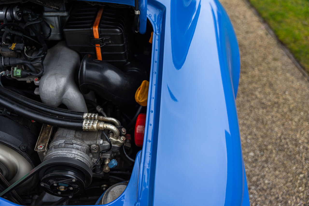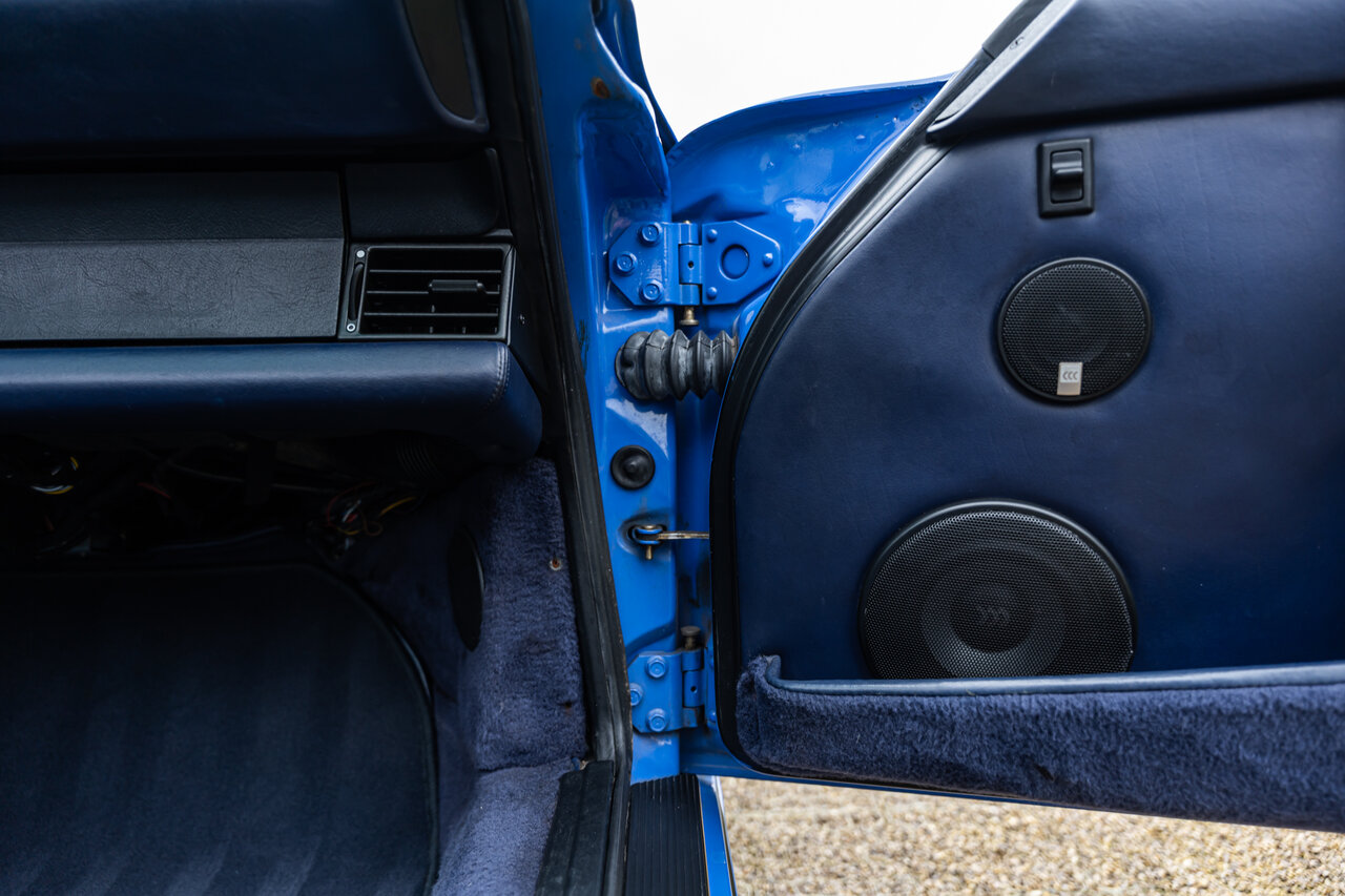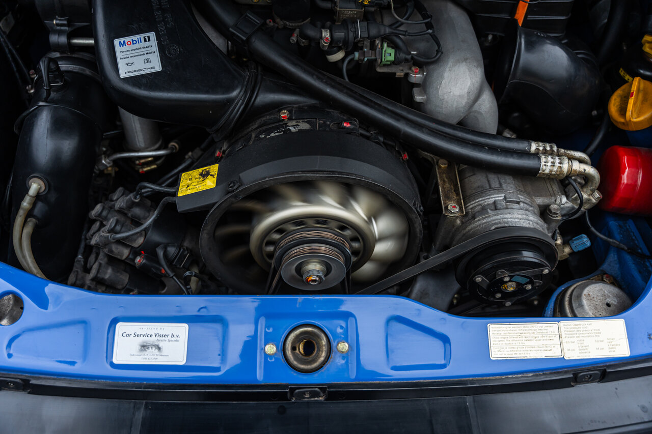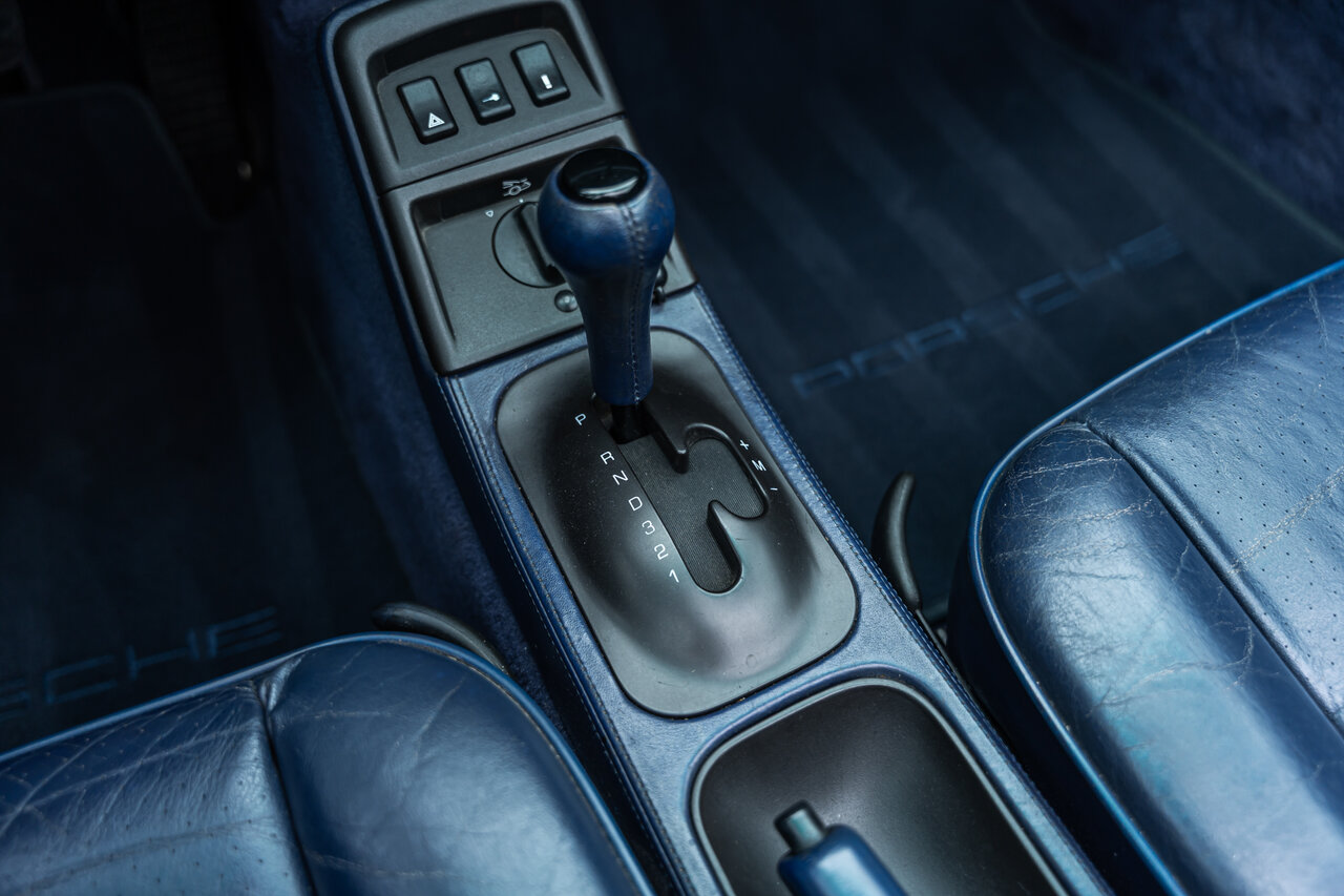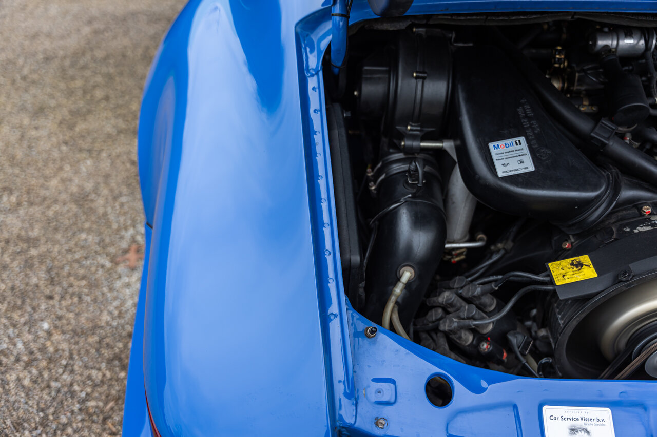 Het interieur is uitgevoerd in volledig lederen Cobalt Blue, wat een sublieme en perfect bijpassende combinatie vormt met de exterieurkleur. Deze unieke specificatie versterkt het exclusieve karakter van deze 964 en maakt het een echte blikvanger.