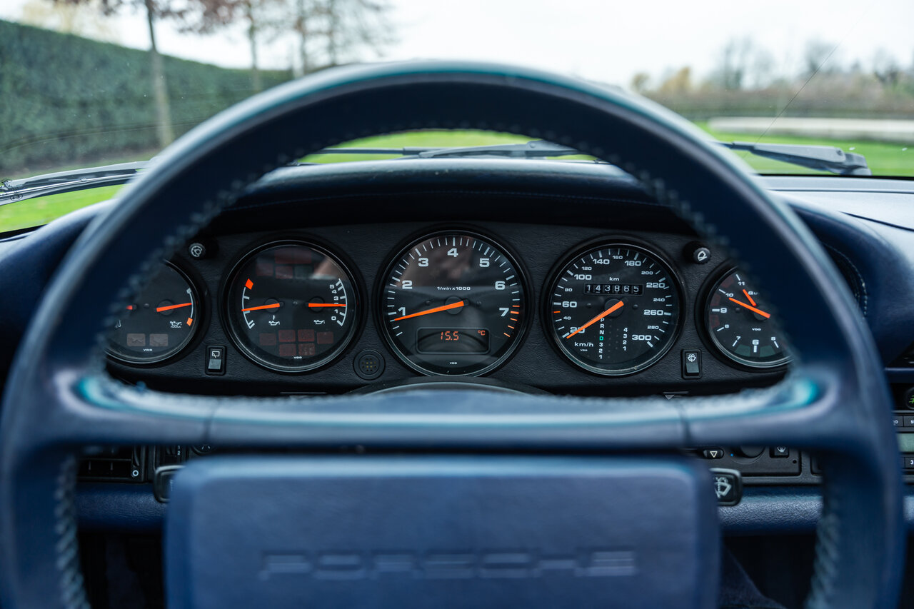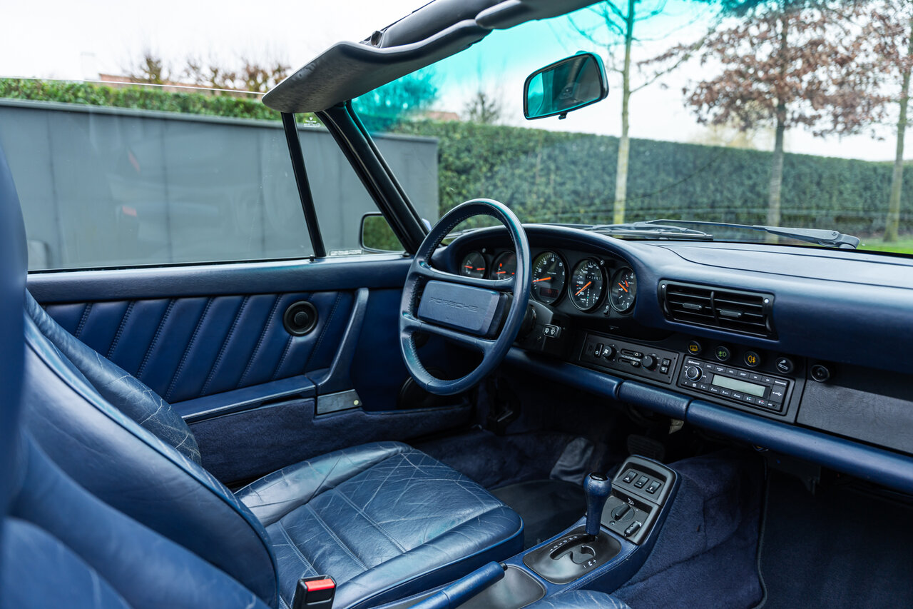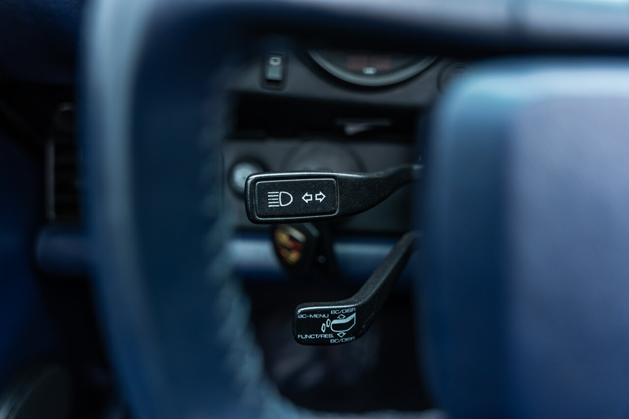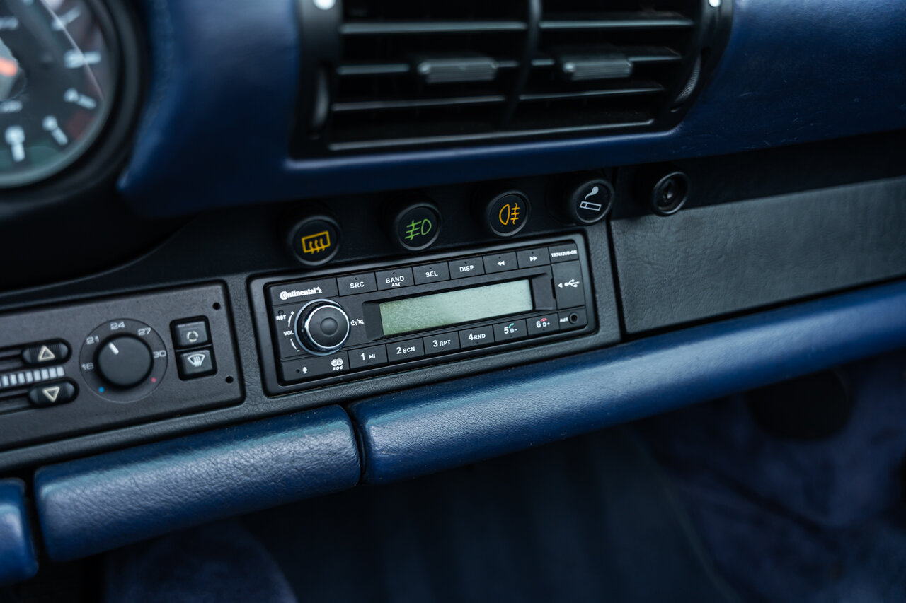 Het interieur is uitgevoerd in volledig lederen Cobalt Blue, wat een sublieme en perfect bijpassende combinatie vormt met de exterieurkleur. Deze unieke specificatie versterkt het exclusieve karakter van deze 964 en maakt het een echte blikvanger.