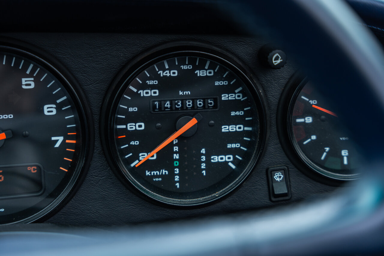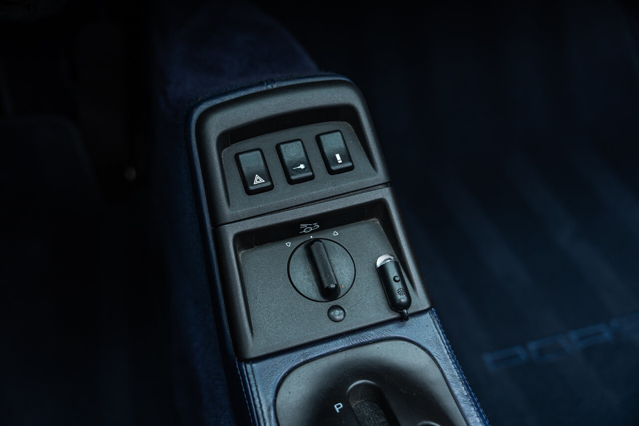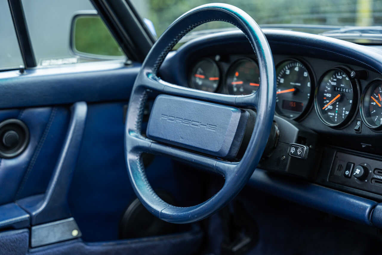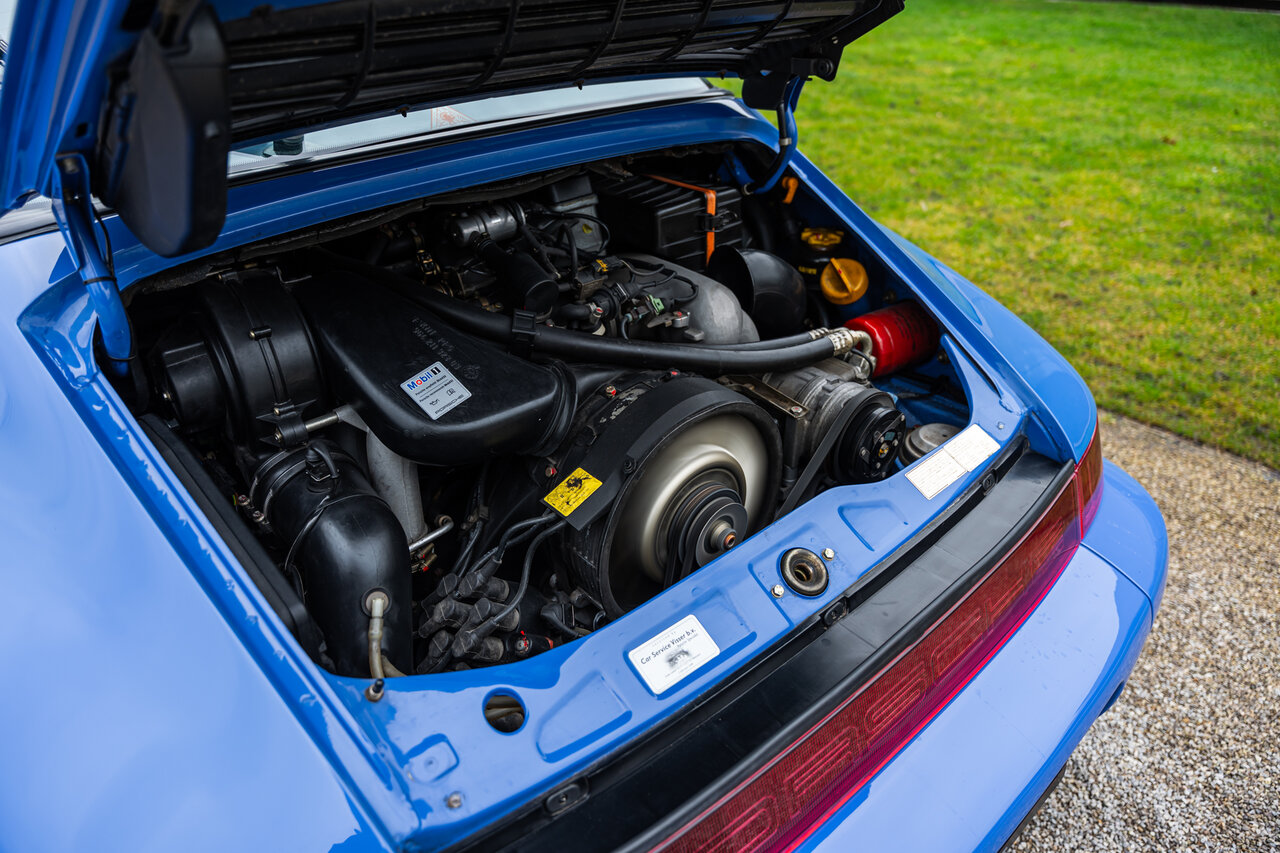 Het interieur is uitgevoerd in volledig lederen Cobalt Blue, wat een sublieme en perfect bijpassende combinatie vormt met de exterieurkleur. Deze unieke specificatie versterkt het exclusieve karakter van deze 964 en maakt het een echte blikvanger.